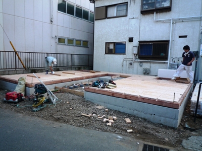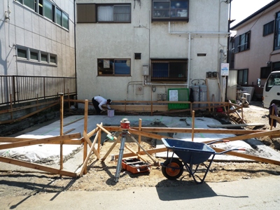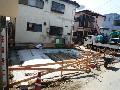 今日行っていた作業は、基礎と床の間に断熱材を敷いてその上に板を置いて、連射出来る釘を打つ道具でバチン、バチン。そしてトンカチでガン、ガン、ガンとやっていました。