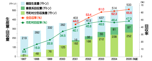ペットボトルの樹脂生産量は、1997年が約21万9千トン、2005年が約53万3千トンと